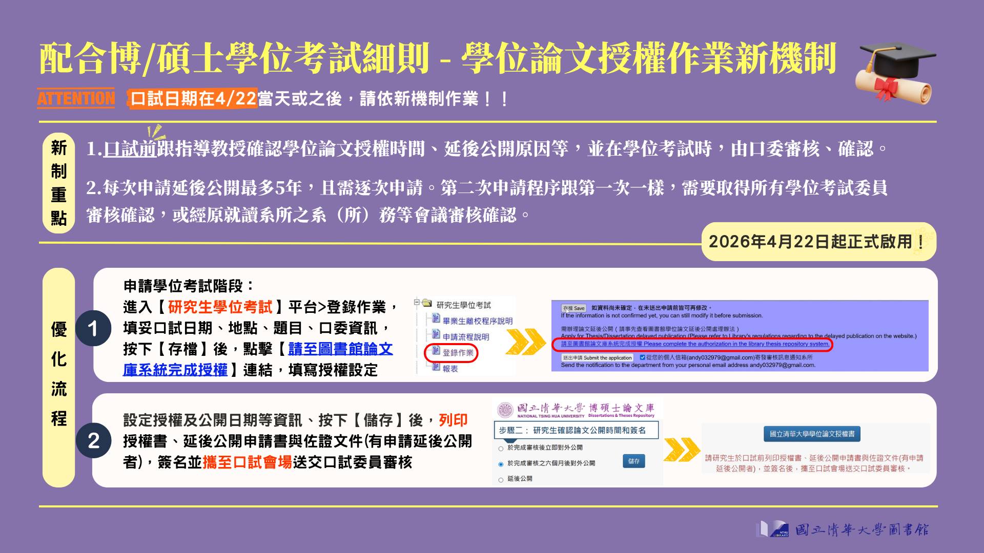 二、為配合上開規定修正,本校圖書館自本(115)年4月22日起實施學位論文授權作業新機